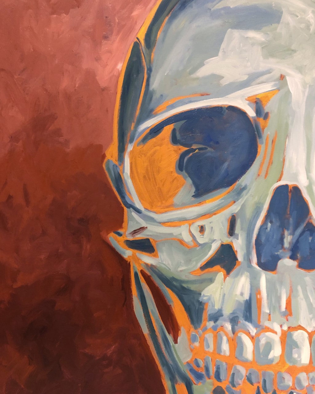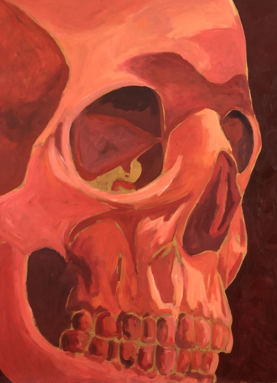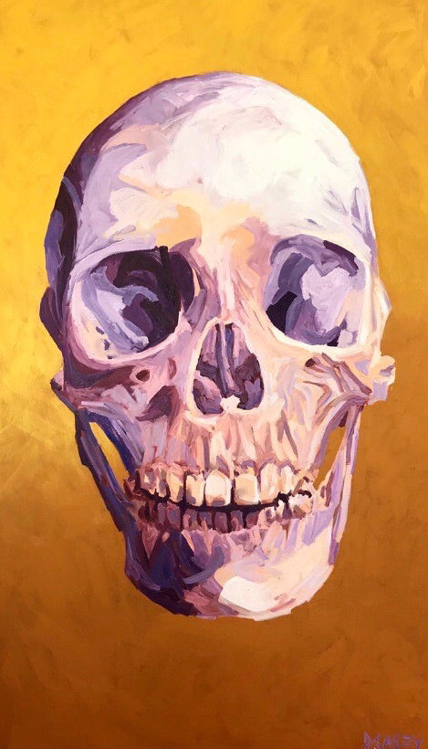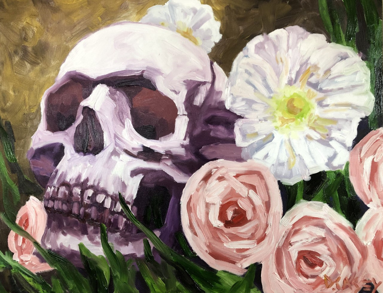 The Dutch painted ‘vanitas’ scenes with skulls, flowers and slightly rotting fruit to express the brevity of time and to remind us to make the most of the time we have. I often think about how fast time flies and the ephemeral nature of youth and beauty. I’ve painted these skulls as my ode to the Dutch masters.